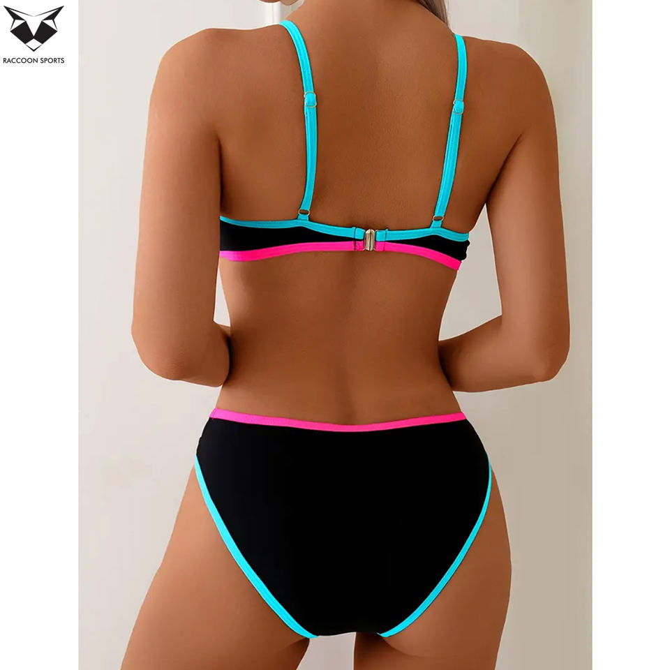 Conjunto de Bikini de Dos Piezas de Poliéster y Spandex para Mujer, Color Neón, Diseño Color Block, Ligero, Calidad Premium, Hecho en Pakistán, Ropa de Verano