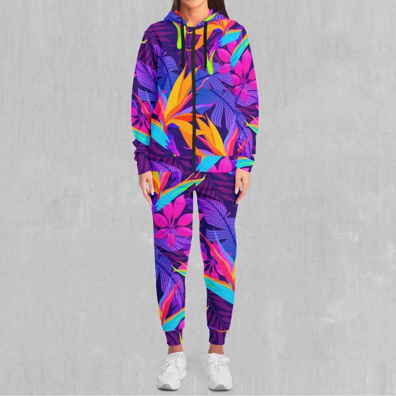 Neon Jungle Tropical Printed 100% algodón transpirable ligero invierno Hip Hop Zip-Up Hoodie y Joggers Set chándal