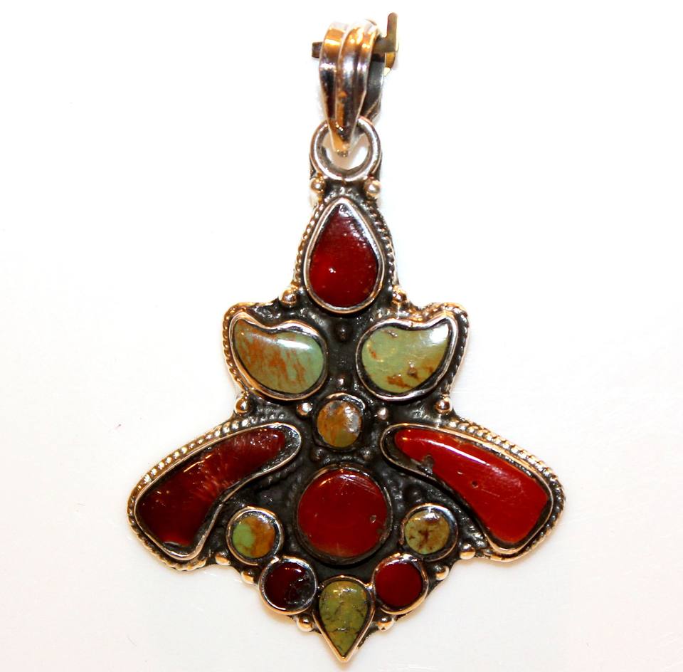 Auténtico nepalí 925 colgante de plata esterlina hecho a mano Multi-piedra preciosa turquesa Coral Popular forma de gota Ajuste de bisel