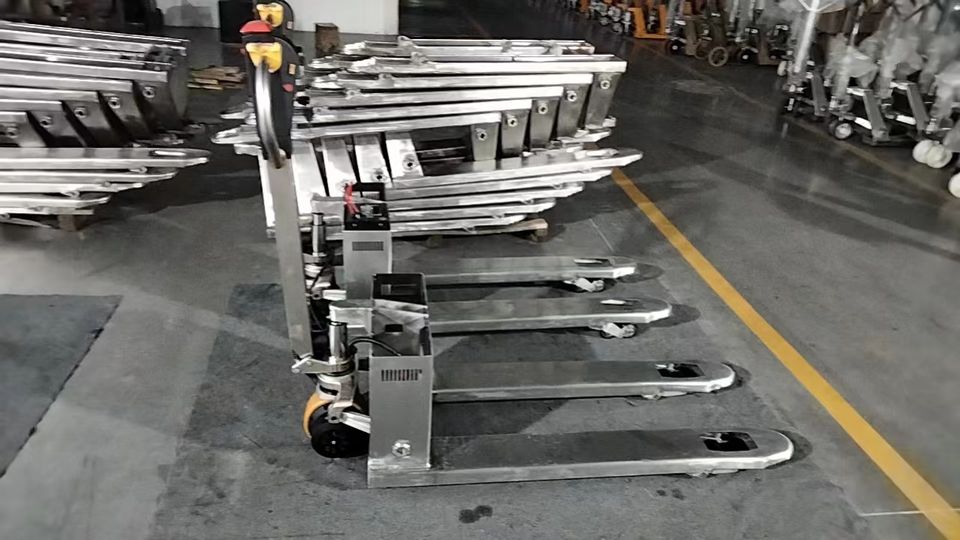 Transpaleta eléctrica de acero inoxidable de 1,5 toneladas y 1500kg, batería de plomo-ácido de acero 304 de 48V/20Ah para talleres de reparación de maquinaria