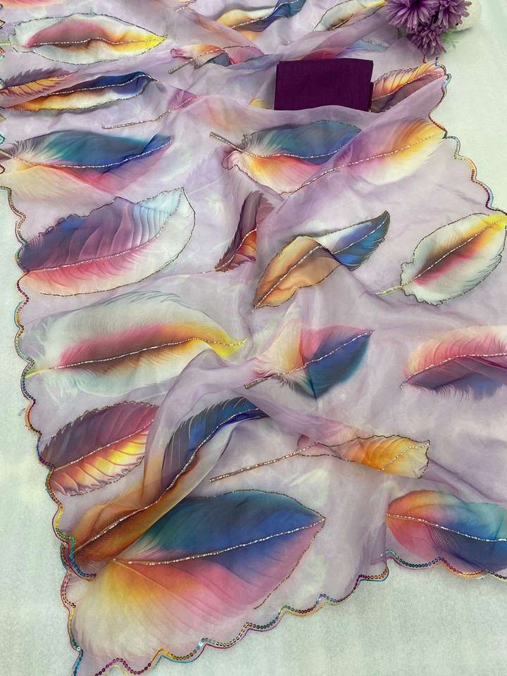 Nombre del producto:Organza de color increíble con impresión de mano con trabajo de mano Saree