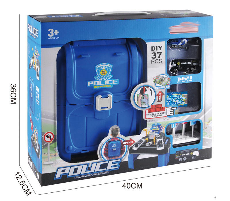 Nueva llegada mochila 37PCs DIY Polices Die Cast Car Parking Lot Track Toy Set con mapa para niños