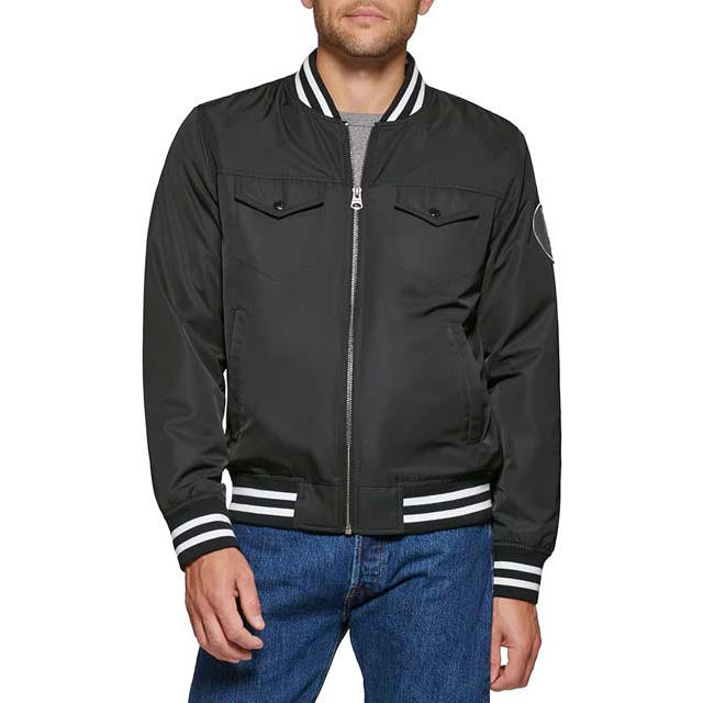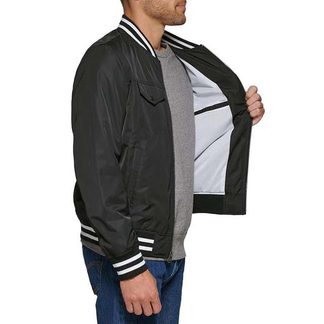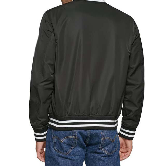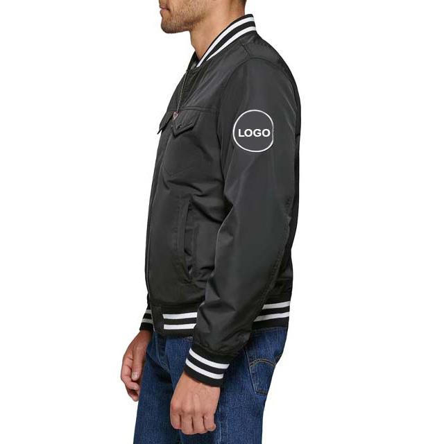 Nueva llegada de color negro OEM logotipo personalizado blanco rayas diseño cremallera ropa de hombre Chaquetas Chaqueta de béisbol universitaria para hombres 2025