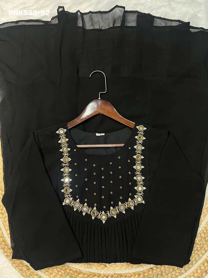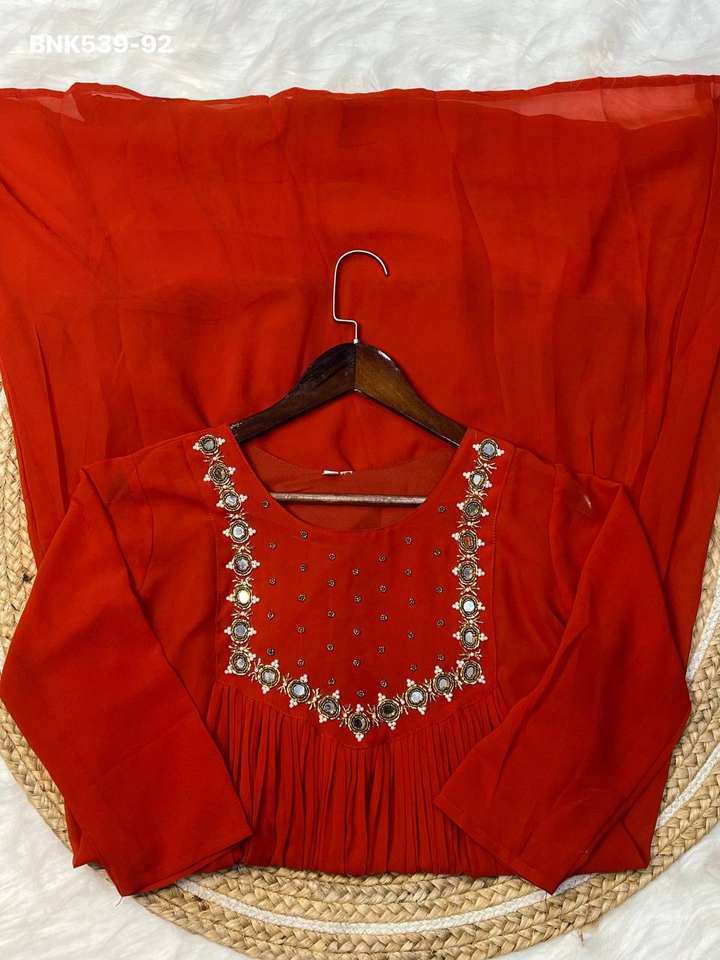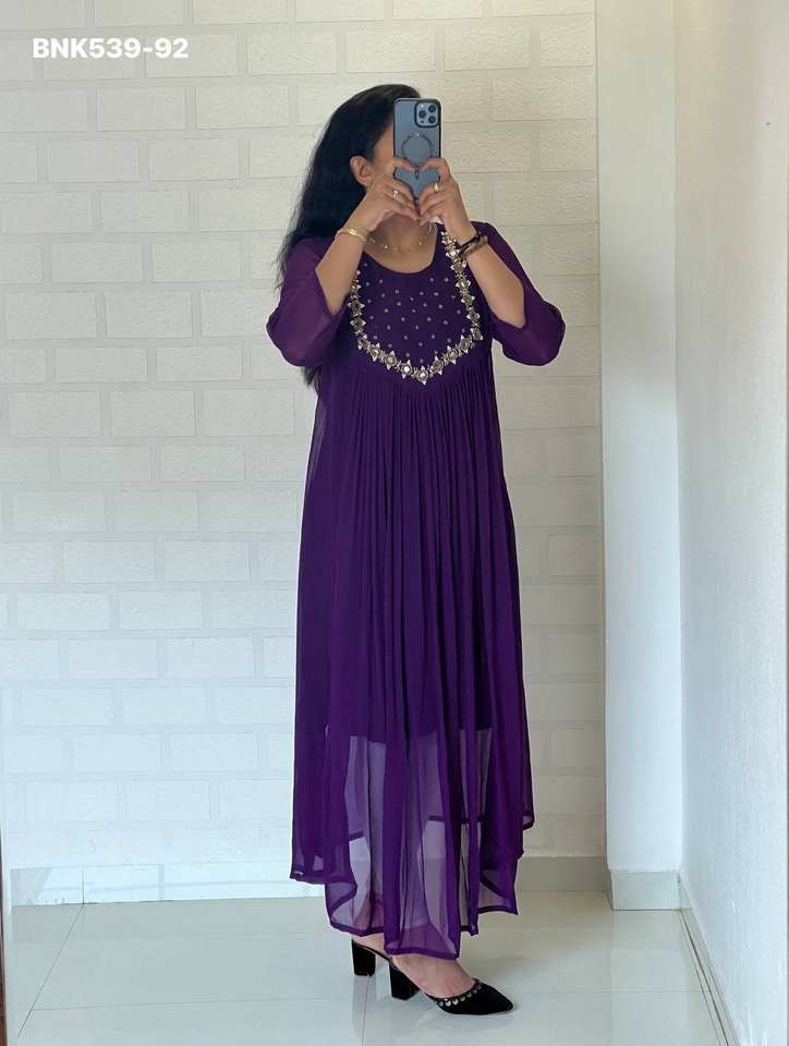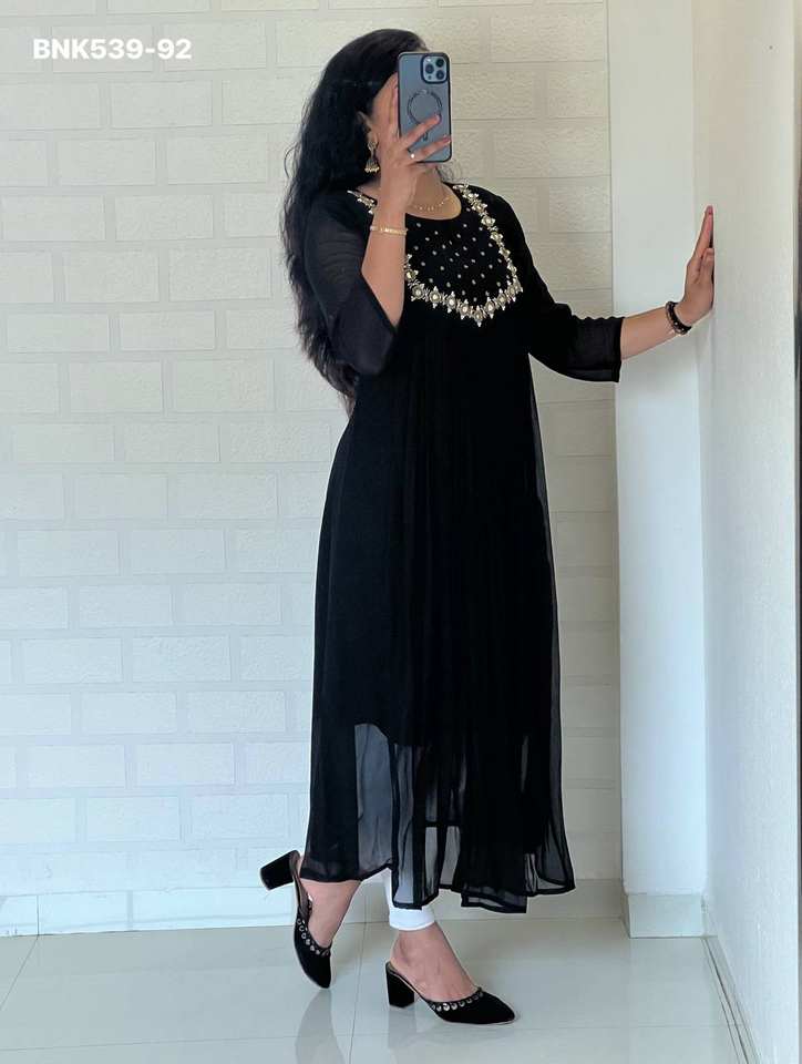 Nombre del Producto:Nueva llegada: Kurti de georgette floreciente con espejo real y trabajo a mano