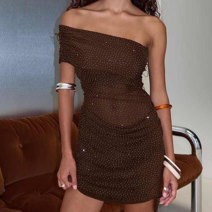 Nuevo Vestido Mini Marrón de Un Solo Hombro con Pedrería y Malla Fruncida para Mujer, Vestido de Fiesta de Otoño con Cintura Natural