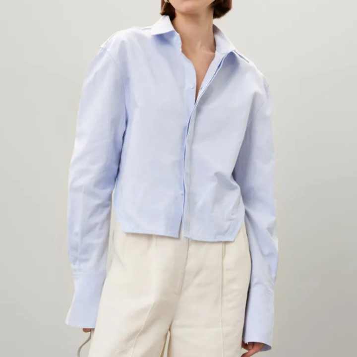 Camisa de Manga Larga con Cuello y Detalle de Espalda Descubierta, Diseño Personalizado, Color Sólido, Popelina de Algodón para Mujer, Nueva Llegada