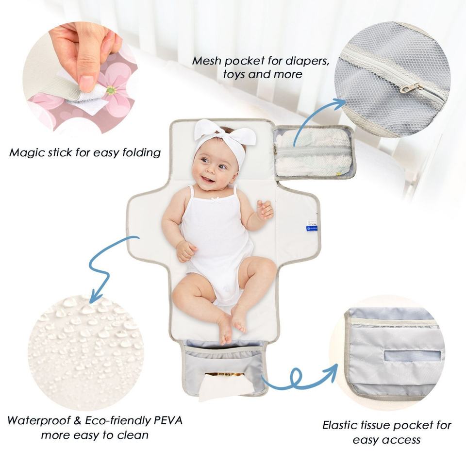 Nueva llegada: Colchoneta portátil impermeable plegable con diseño floral para cambiar pañales de bebé, con bolsillo.