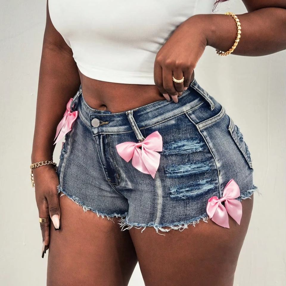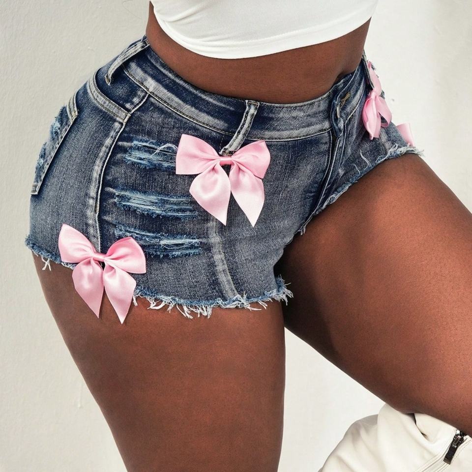 Novedad: Shorts de mezclilla mini de tiro alto con etiqueta personalizada, estilo urbano, 100% algodón, lavado ácido, sexy, desgastados, con lazo.