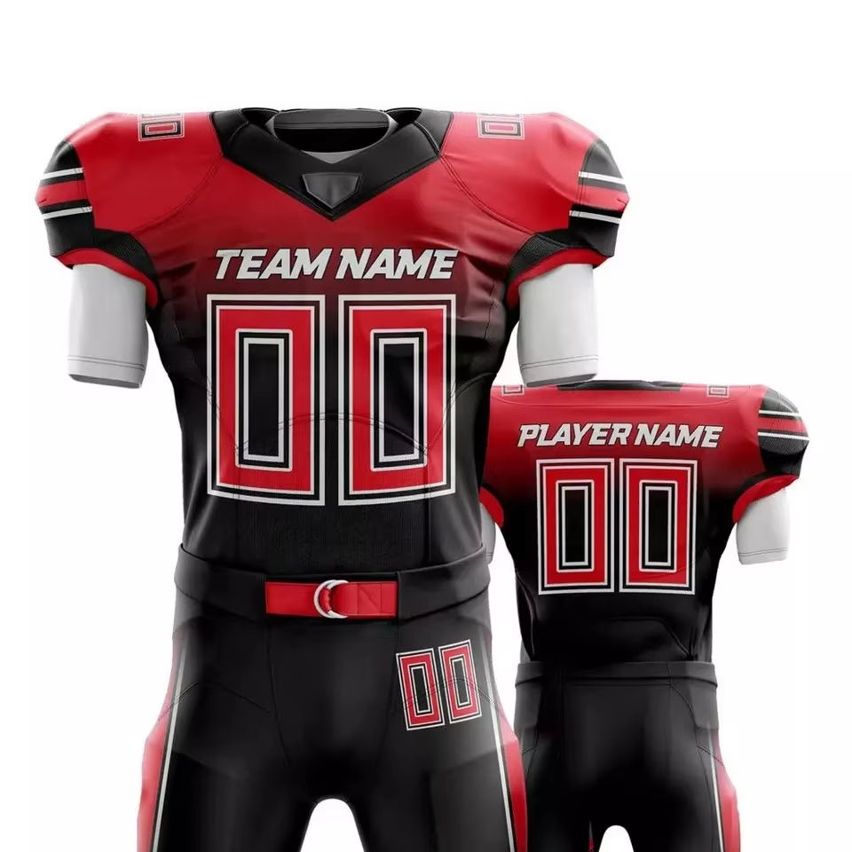 Nueva llegada logotipo personalizado impreso equipo de fútbol americano desgaste transpirable sublimación más tamaño característica uniforme de manga corta
