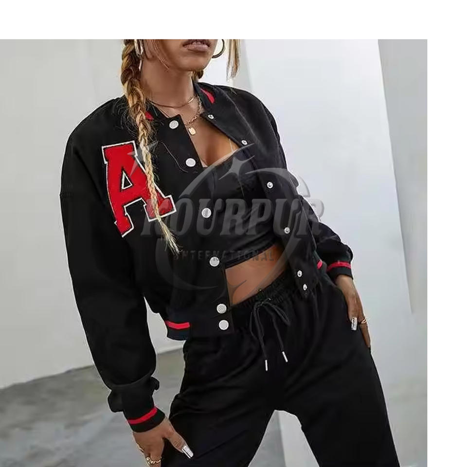 Chaqueta recortada con letras de chenilla bordadas para mujer de alta calidad hecha a medida para la temporada de otoño/invierno botón transpirable