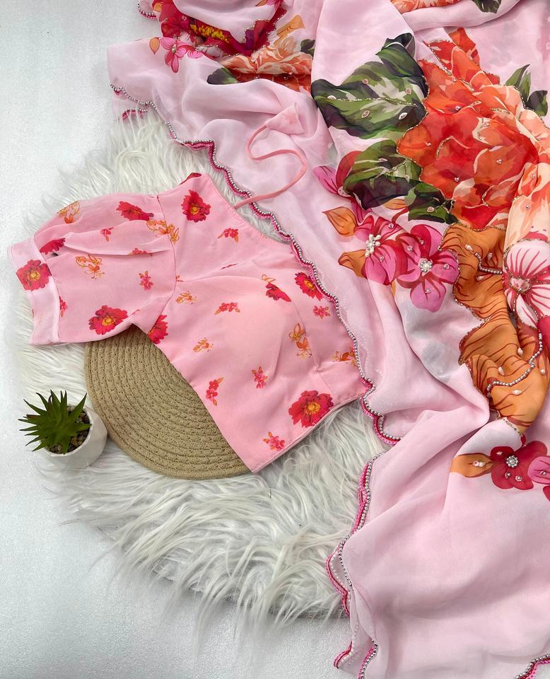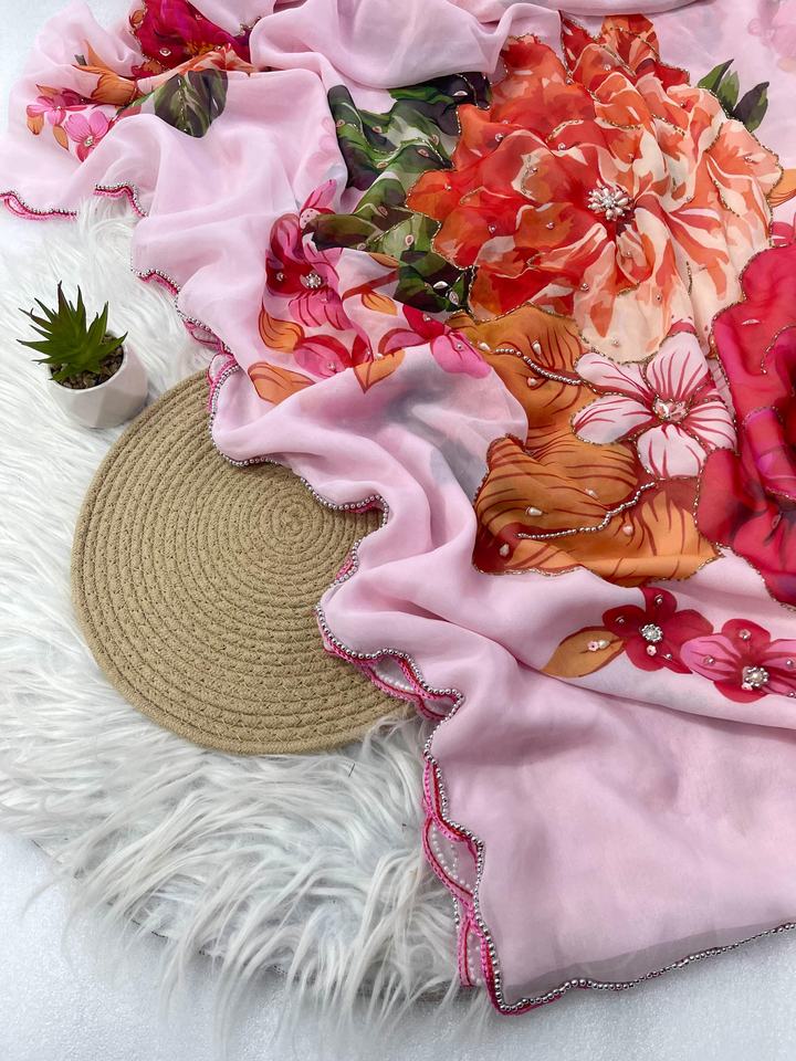 Sari de seda Georgette suave de estilo moderno y elegante de diseñador recién llegado con trabajo hecho a mano y piedra blanca Moti Border Work proveedor indio