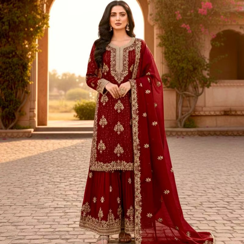 Nuevo Conjunto de Traje Listo para Usar para Mujer, Diseño de Alta Costura, Top de Seda Pesada, Pantalones Palazzo y Dupatta con Pedrería de Circonio Real, Calidad de Exportación