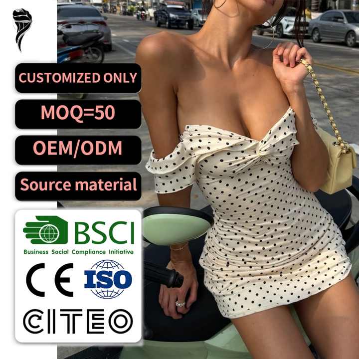 Nuevo Vestido Mini Sexy con Cuello en V y Hombros Descubiertos para Mujer, Diseño Personalizado de Fábrica OEM ODM, Vestido Mini con Estampado de Lunares para Fiesta en la Playa
