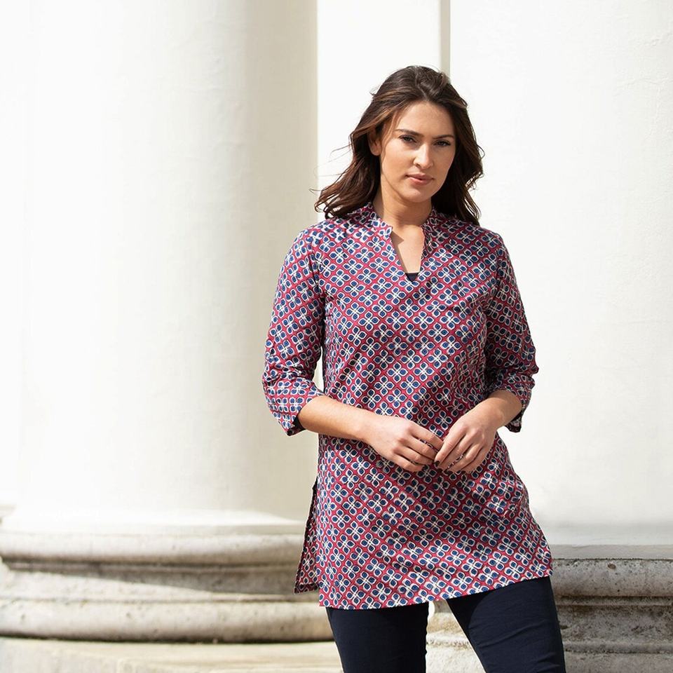OFERTA Blusa Larga Kurta Todas las Tallas Estilo 1 Rojo Ciruela con Azul Zafiro 100% Algodón Ligero Cuello en V Estampado Floral Manga Larga
