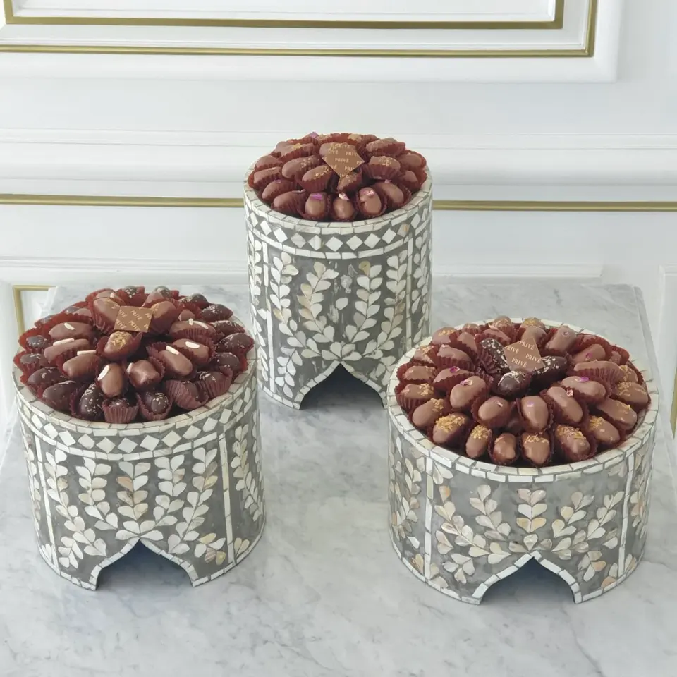 Nueva llegada de lujo árabe chocolate madre de perla bandeja, EID madre de perla soporte para pastel bandeja para servir hecha en Vietnam