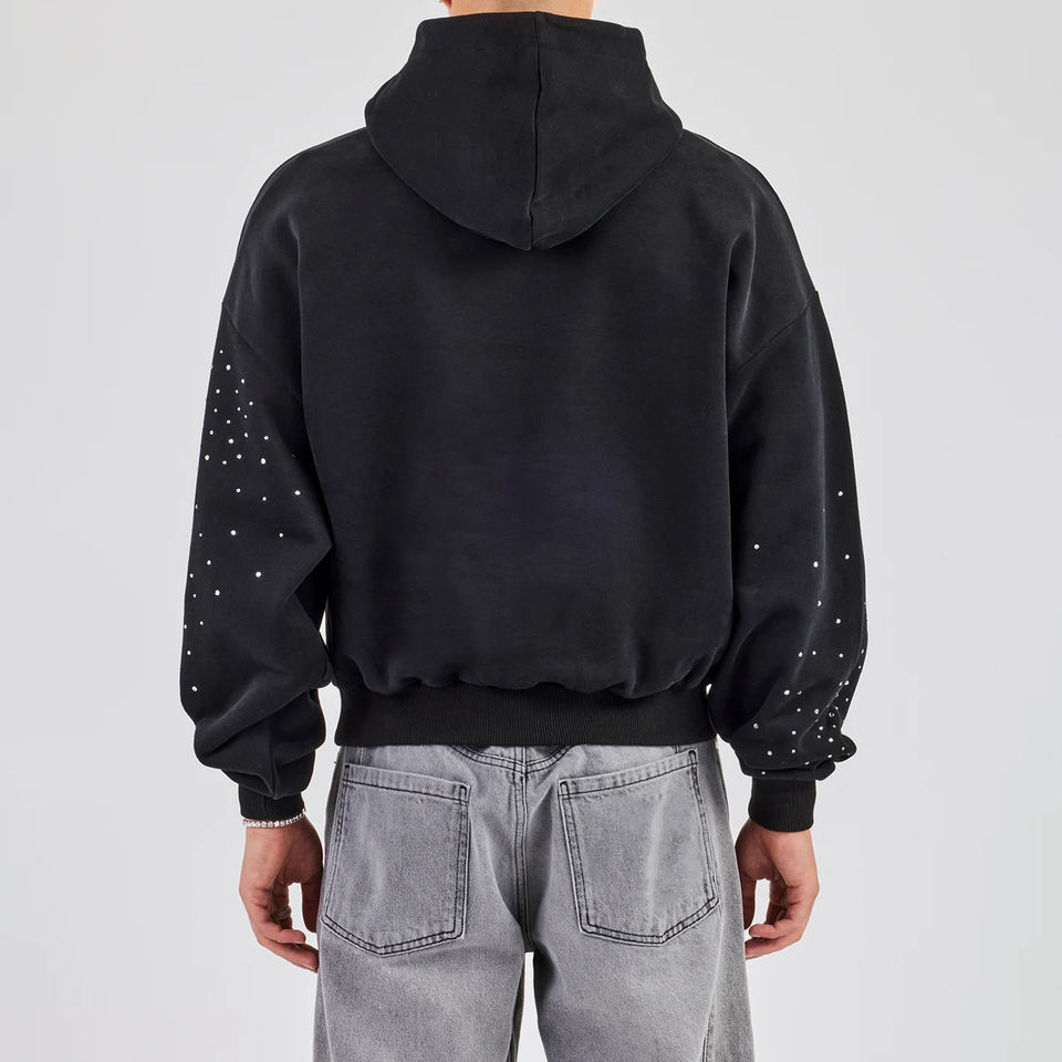 Novedad, Sudadera con Capucha para Hombre, Bordada y Personalizable con Cristales, Mangas Largas, Corte Cuadrado, Bolsillos Tipo Canguro, Lavado Ácido