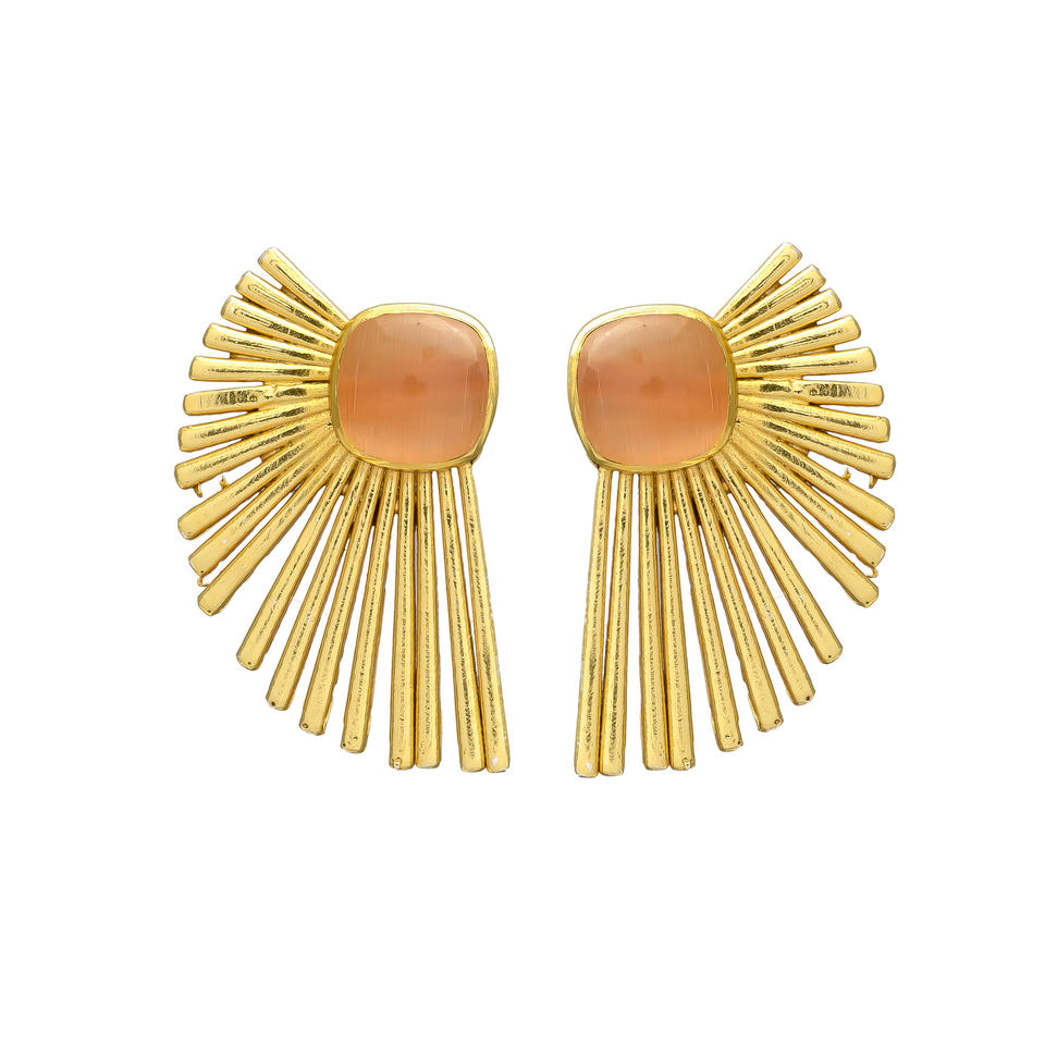 Nueva llegada melocotón Calcedonia piedra preciosa chapado en oro conjunto de aretes
