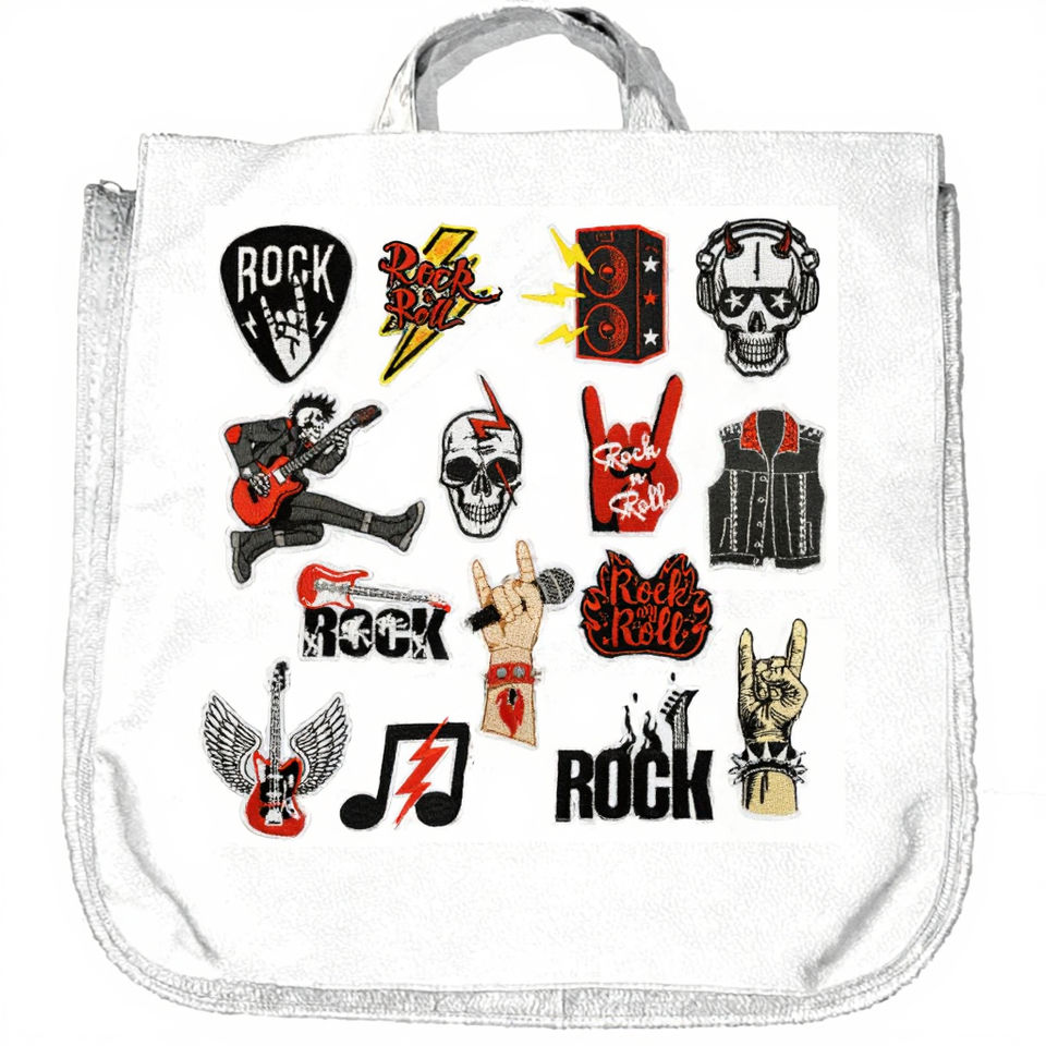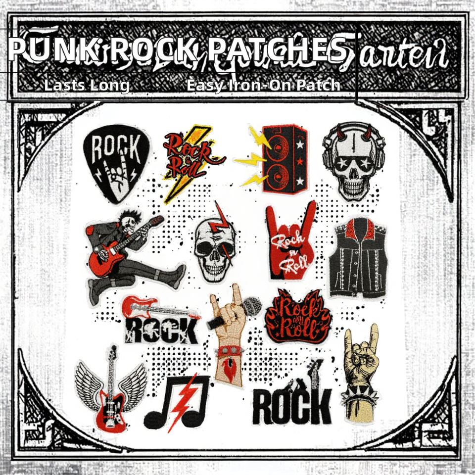 Parches Bordados Termoadhesivos con Diseño de Calavera Negra, Estilo Punk Rockero, Tema Musical de Guitarra, para Chaquetas y Ropa