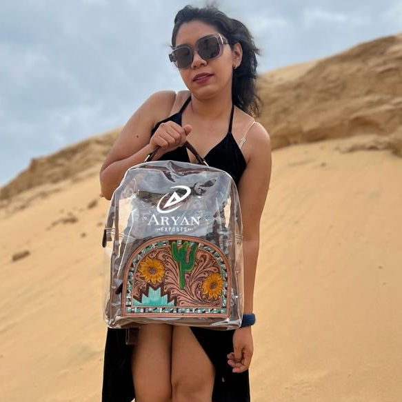 Recién llegado, mochilas transparentes de PVC de cuero con herramientas manuales reales, mochilas transparentes de cuero con estilo, bolsas de estadio de estilo occidental