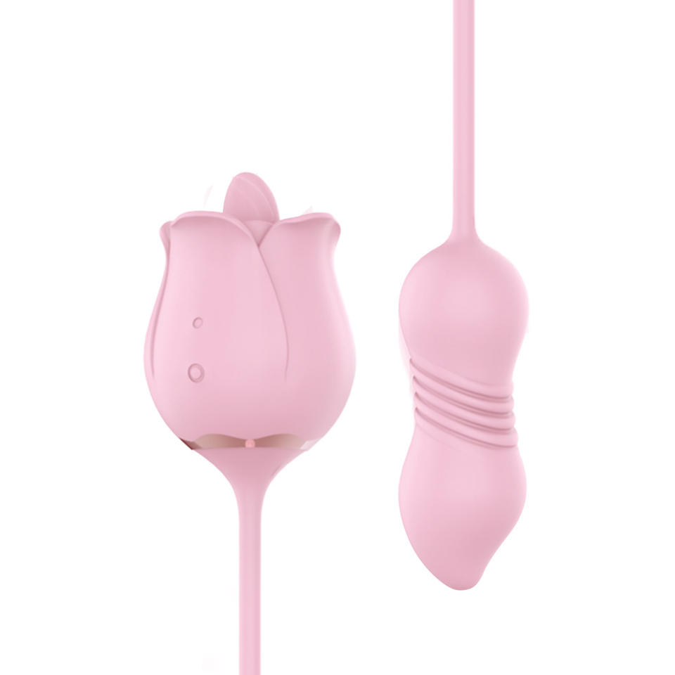 Vibrador de huevo rosa para lamer el clítoris con la mano y la lengua