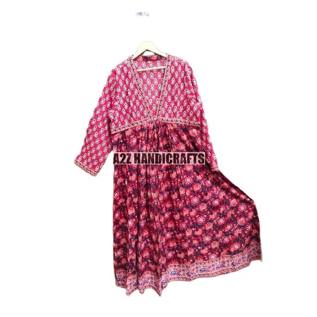 Nueva llegada de las mujeres de encaje personalizado vestido de línea a elegante bloque de mano de impresión de algodón patrón de costura Maxi estándar de talla grande