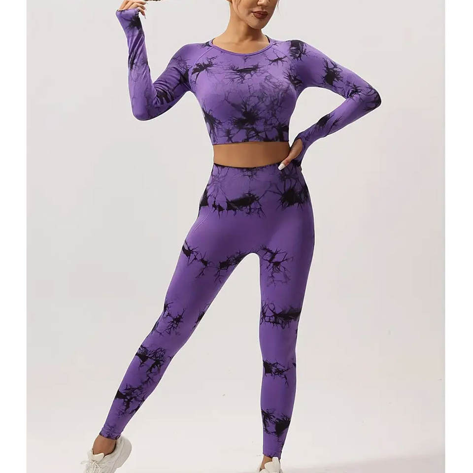 Nueva llegada mujeres Tie Dye Smile Face Seamless Yoga Set manga larga melocotón cadera alta cintura Leggings