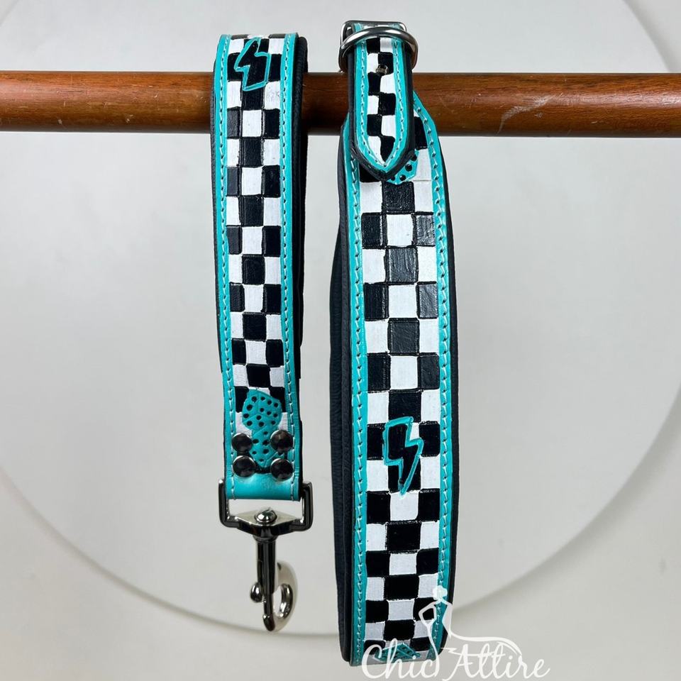 Recién llegado, patrón de tablero de ajedrez, correa de perro de cuero y Collar, juegos de cables de tráfico adecuados para perros pequeños y medianos