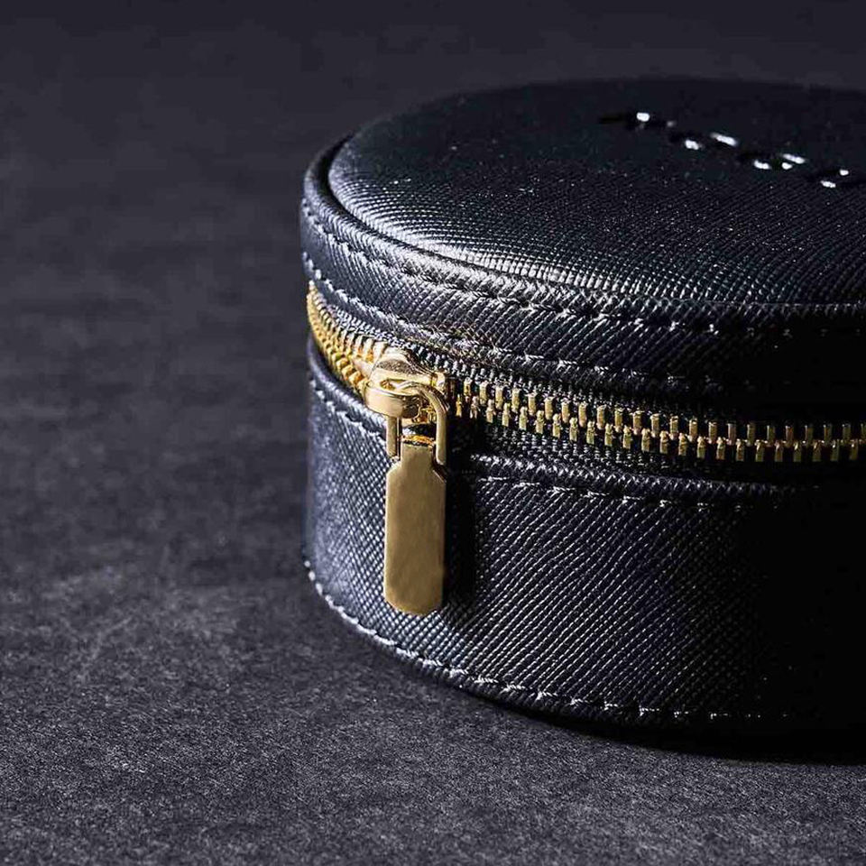 Instalación:Caja de joyería redonda de cuero.