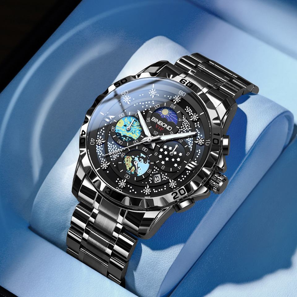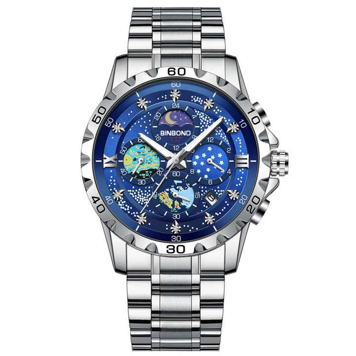Característica:Cronógrafo, Día/fecha, Resistente al agua, Impermeable, Luminoso, Manos luminosas, Cronómetro, Tres pequeños aguja