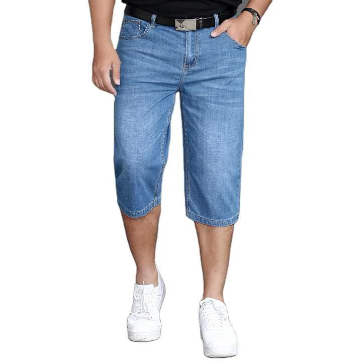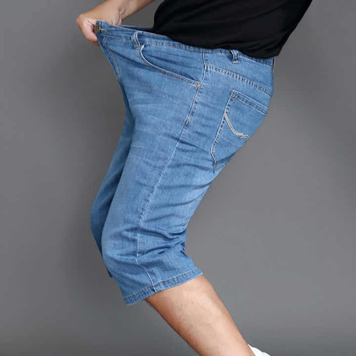 Nuevos pantalones cortos de mezclilla de talla grande de longitud larga para hombre con diseño de punto elástico suelto delgado para verano ligero grande