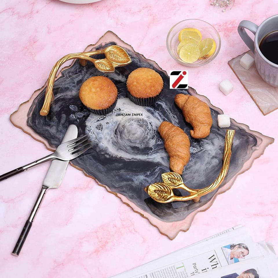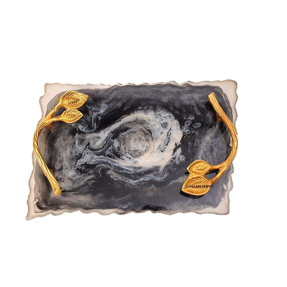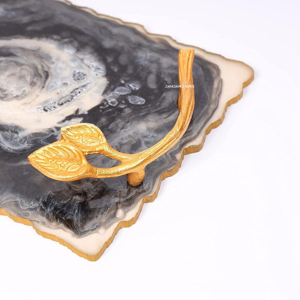 Bandeja/plato multiusos de resina de nube negra con mango floral de metal dorado Bandeja de servicio elegante para el hogar, fiestas y regalos