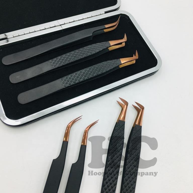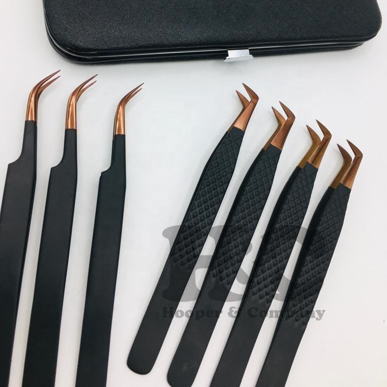 Pinzas de extensión de pestañas con logotipo personalizado, herramienta de acero inoxidable negro de visón, pinzas de volumen ecológicas con acento de oro rosa inclinado