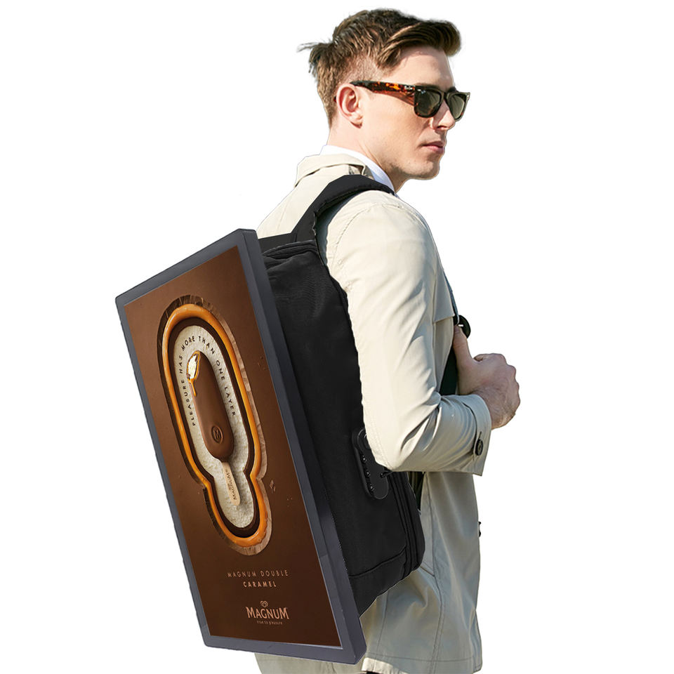Nueva marca de 27 pulgadas LCD Publicidad Mochila Cartelera digital Caminar humano Mochila Cartelera Publicidad Cartelera móvil