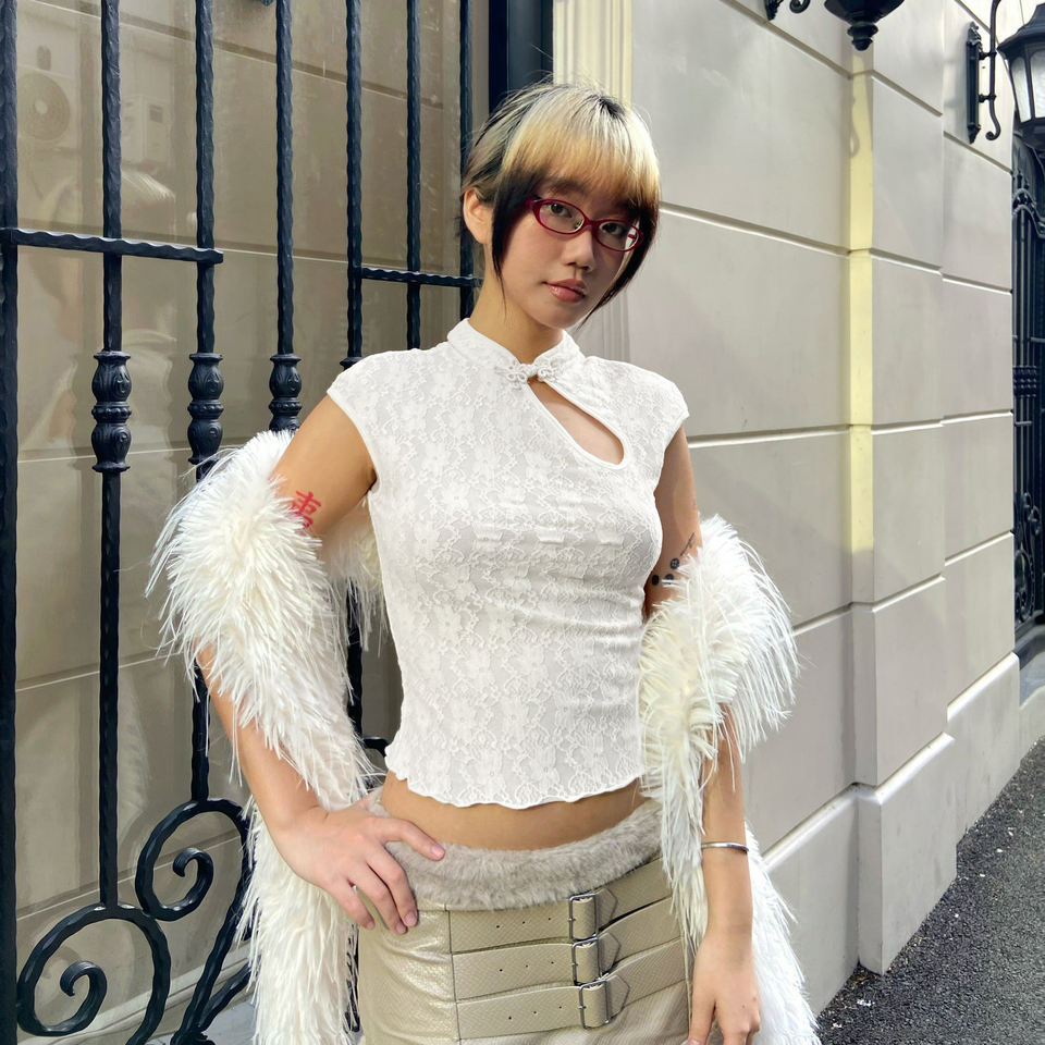 Nuevo Top de Moda Estilo Chino con Encaje y Parches para Mujer, Diseño Hueco con Botones de Rana, Ajuste Delgado, Cintura con Volantes y Manga.