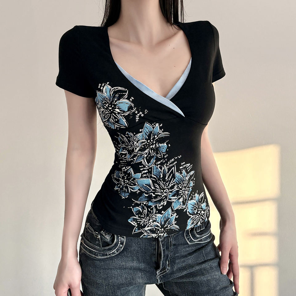 Camiseta de Estilo Chino Retro con Estampado, Cuello en V, Manga Corta, Diseño Básico y Versátil