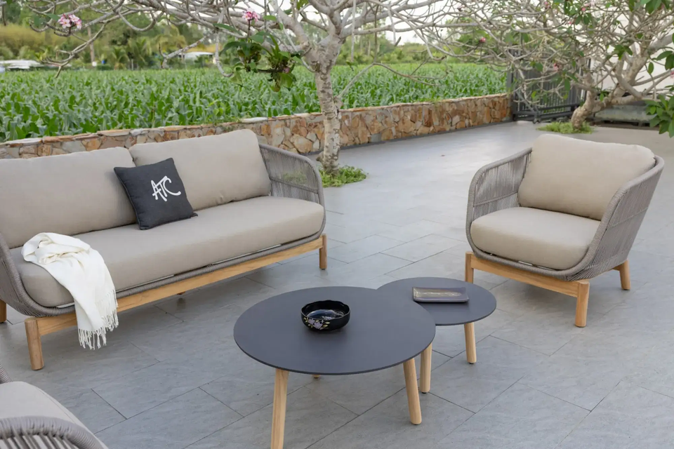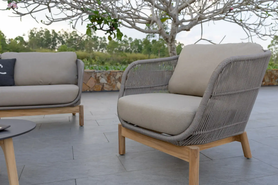 Nueva Colección COVE, Conjunto de Sofás de Cuerda para Exteriores con Estructura de Aluminio y Patas de Teca