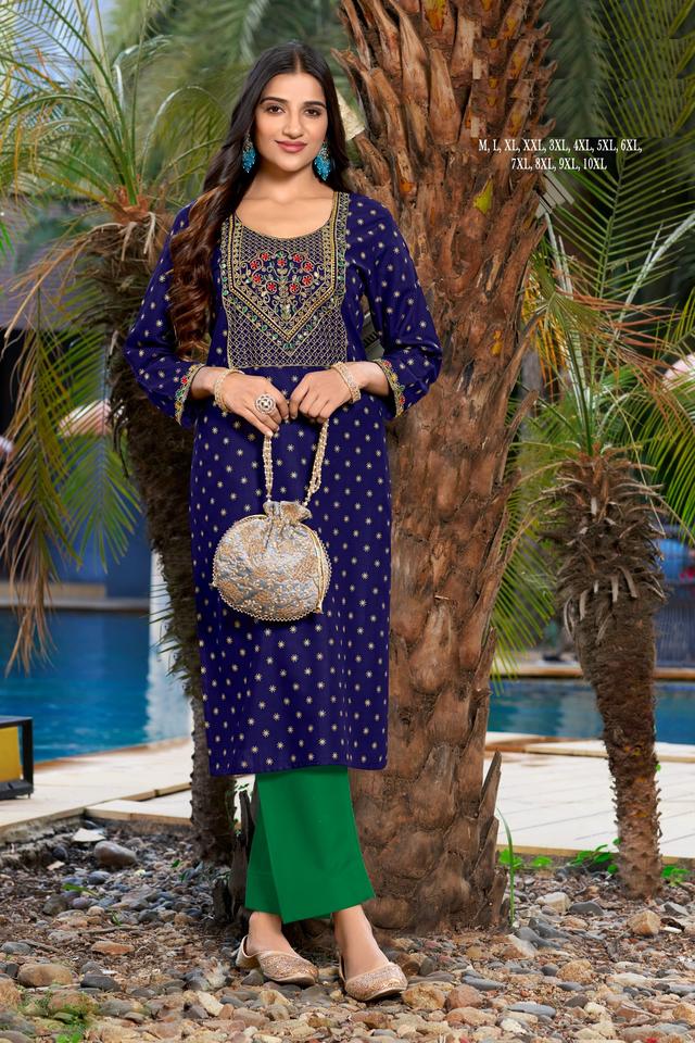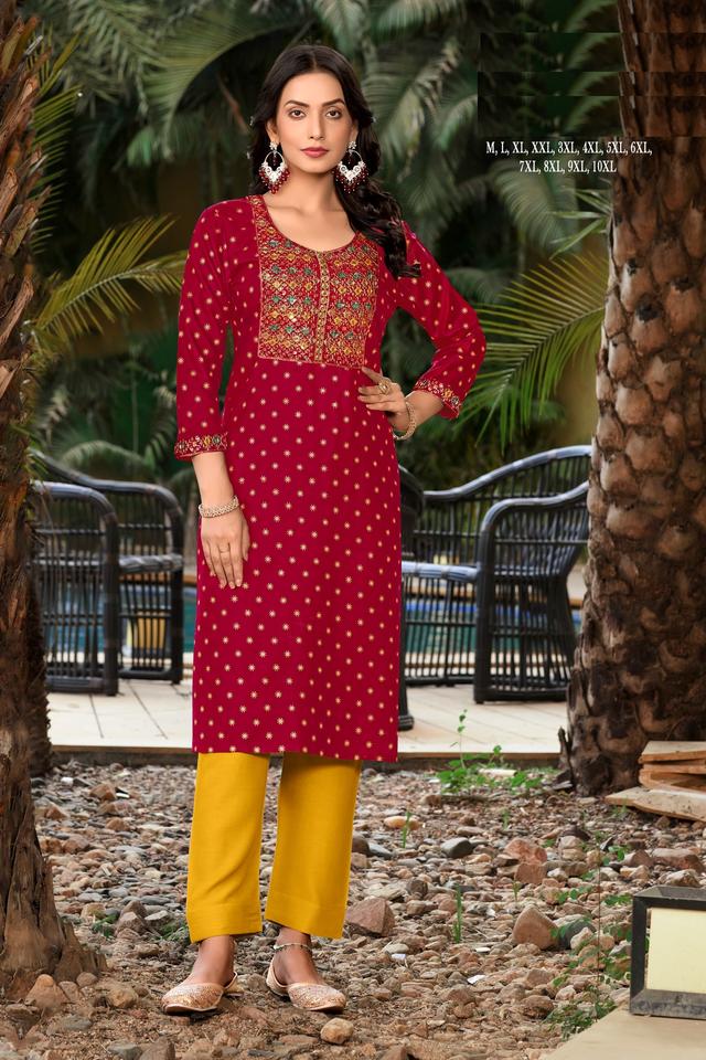 Nueva colección Diseñador Rayon Gold Print Kurti con bordado Work y pantalón a juego Perfecto para el uso regular de la India