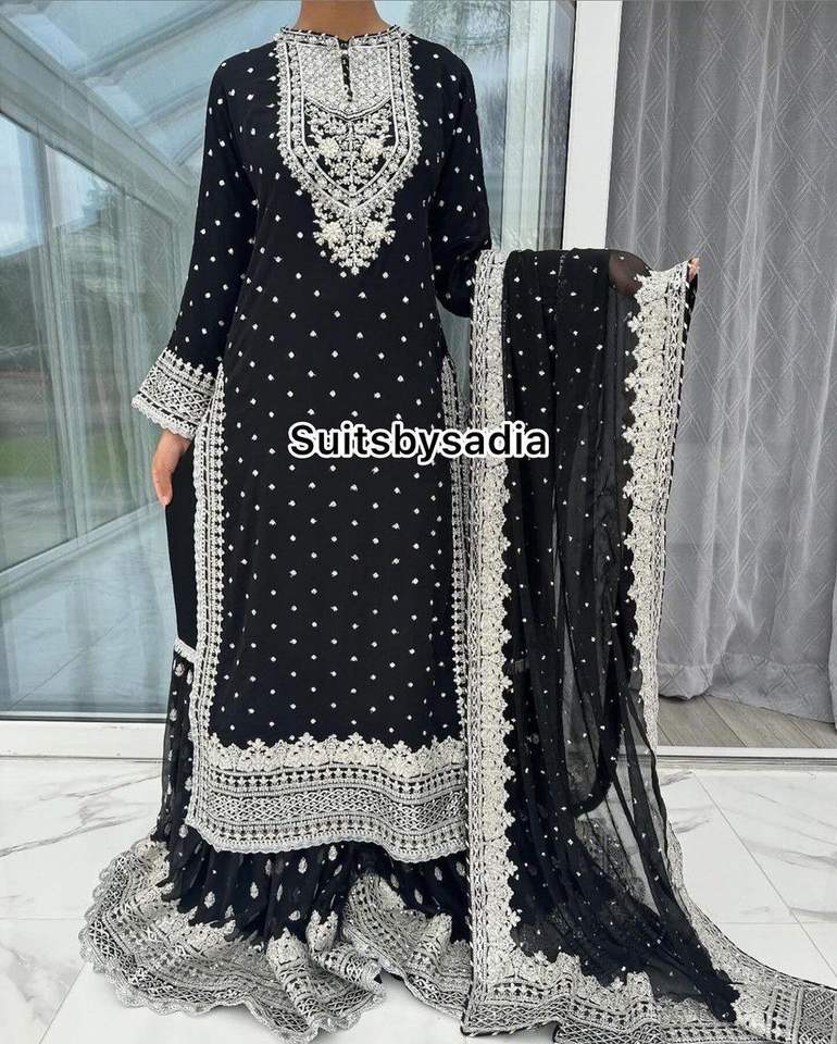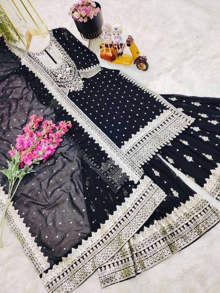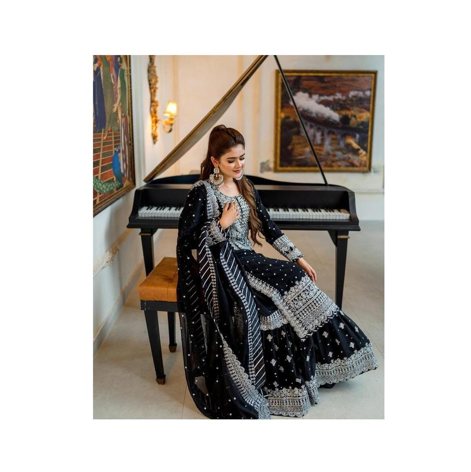 Nueva colección, secuencia de bordado completamente cosida, traje Sharara de trabajo y conjunto Dupatta para ocasiones de fiesta de boda