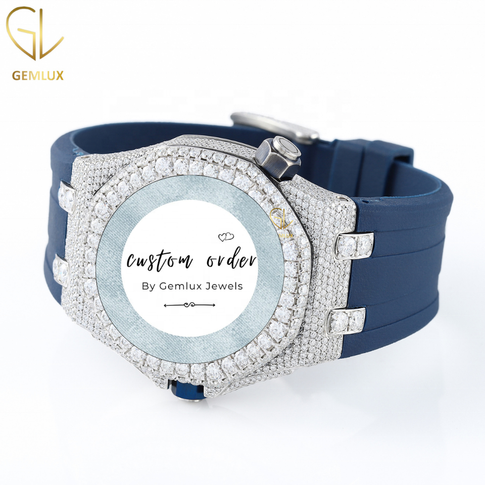 Reloj de Diamantes Moissanite Personalizado para Hombre, Reloj Automático con Incrustaciones de Diamantes, D VVS, Pasa el Test de Diamantes, Correa de Goma Azul, Reloj de Lujo