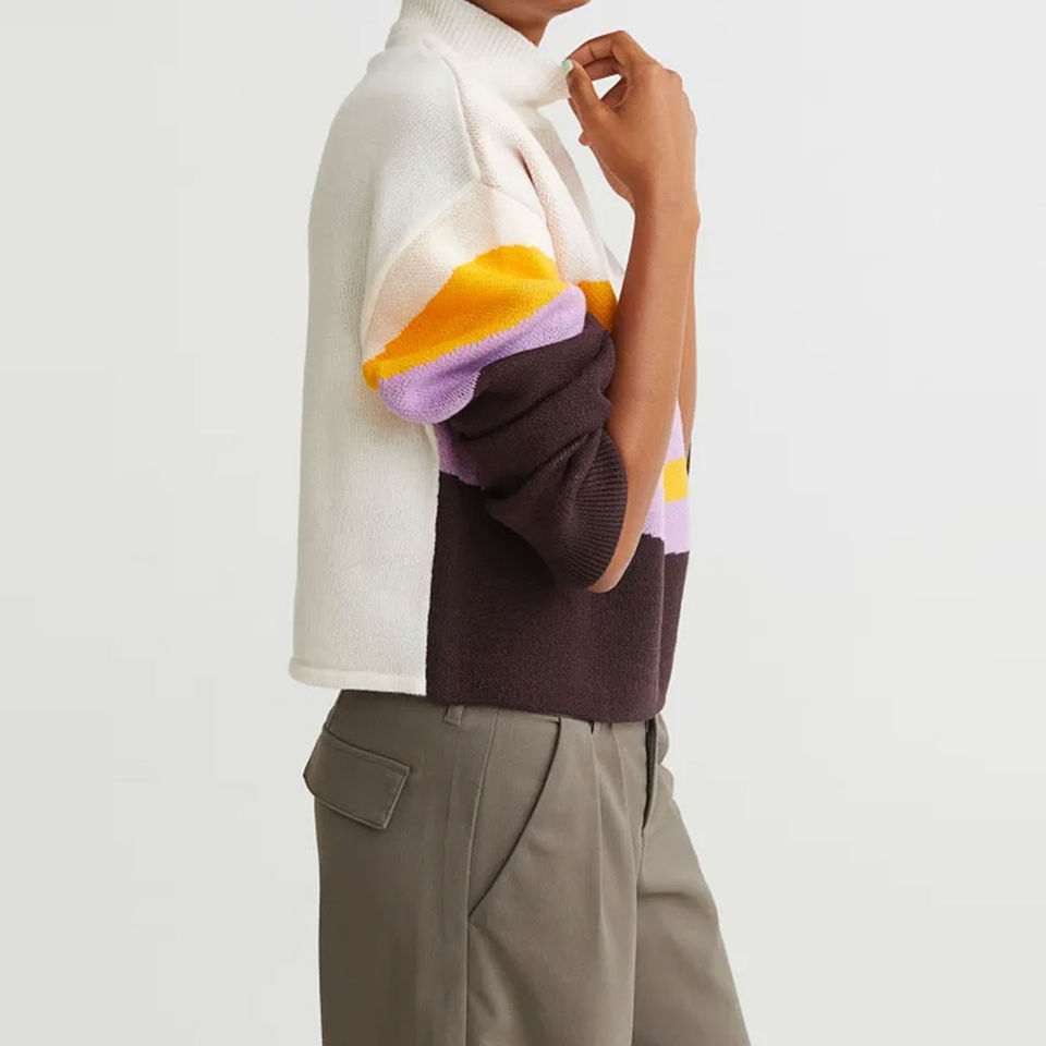 Suéter de Cuello Alto con Bloques de Color, Tejido Grueso, Estilo Moderno con Patrón de Ondas, Cómodo, Holgado, Informal, para Invierno, para Mujer
