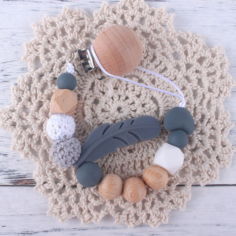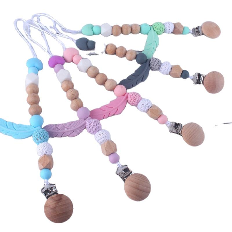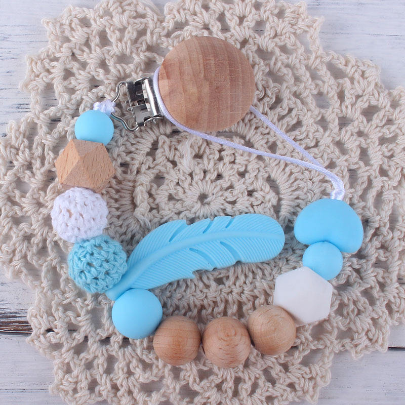Nueva Cadena de dentición de alimentación de bebé personalizada, mordedor de pluma de haya, cadena de chupete de bebé, soporte infantil masticable de ganchillo, Clip de madera