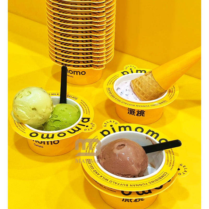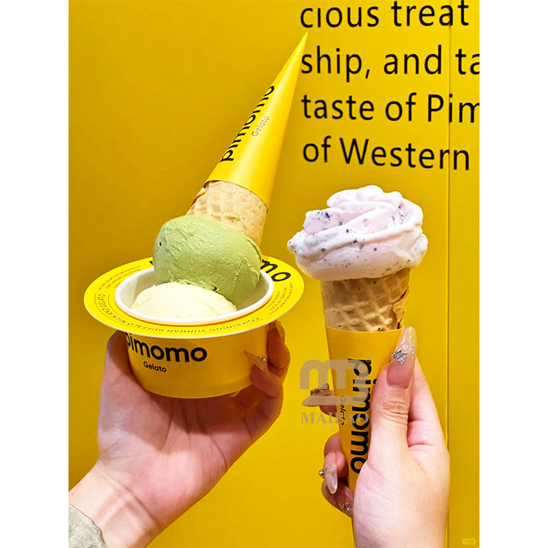 Nuevo diseño personalizado, impresión amarilla para llevar, taza de helado para llevar, servicio suave, Bingsu, yogur, Gelato, taza de papel para helado con cono