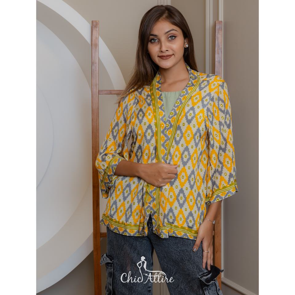 Nuevo vestido personalizado 100% de algodón puro para mujer, Kimono amarillo con estampado Floral, manga con cuello en V, Top Peplum, blusa cómoda de verano