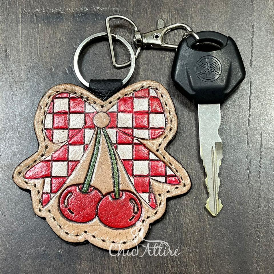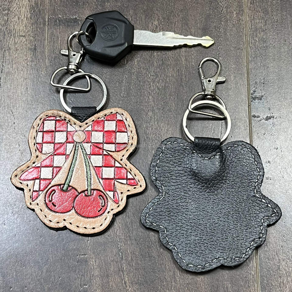 Nuevo Llavero Personalizado de Cuero Genuino con Diseño de Lazo de Cereza y Anillo Metálico, Hecho a Mano con Grabado Cuadriculado, para Unisex