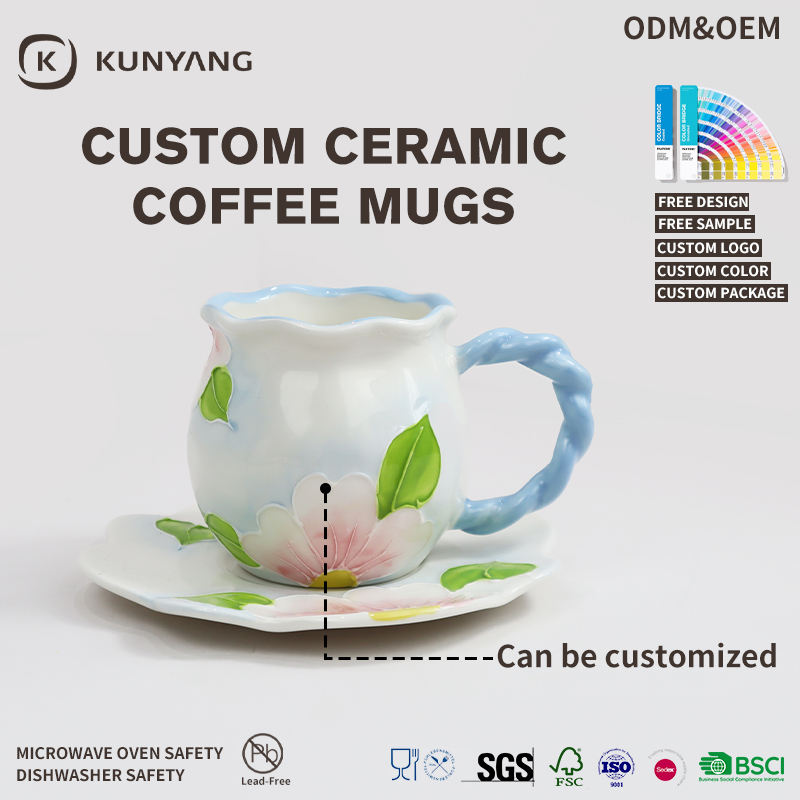 Juego de Taza y Platillo de Cerámica con Diseño de Flores 3D, Borde Ondulado, Asa Retorcida, Taza de Cerámica Grande para Té/Café, para el Hogar y Regalos