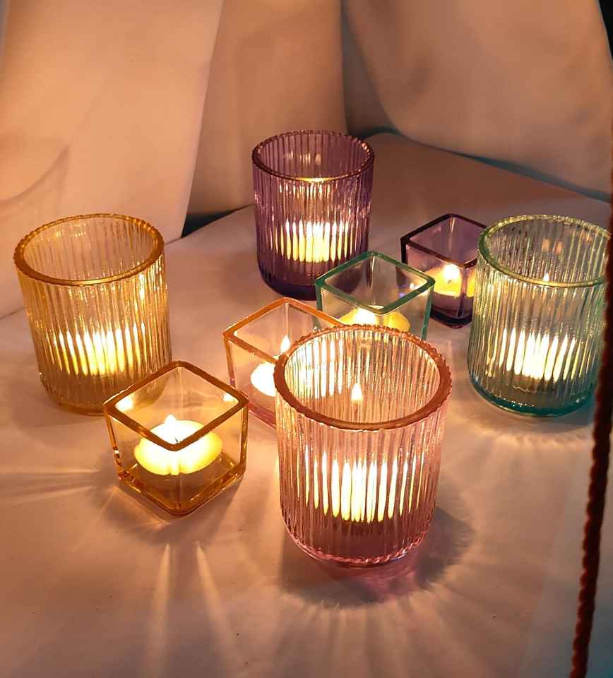 Nuevo diseño de portavelas elegante de vidrio redondo con nervaduras, disponible a precio de fábrica de un fabricante indio.