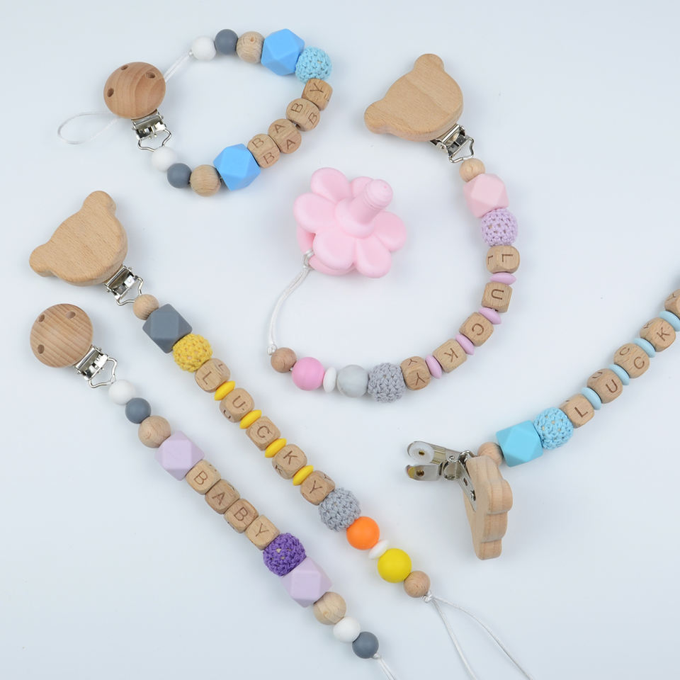 Mordedor de silicona masticable para bebé, soporte de cuentas de felpa de madera para chupete con alfabeto, cadena con Clip