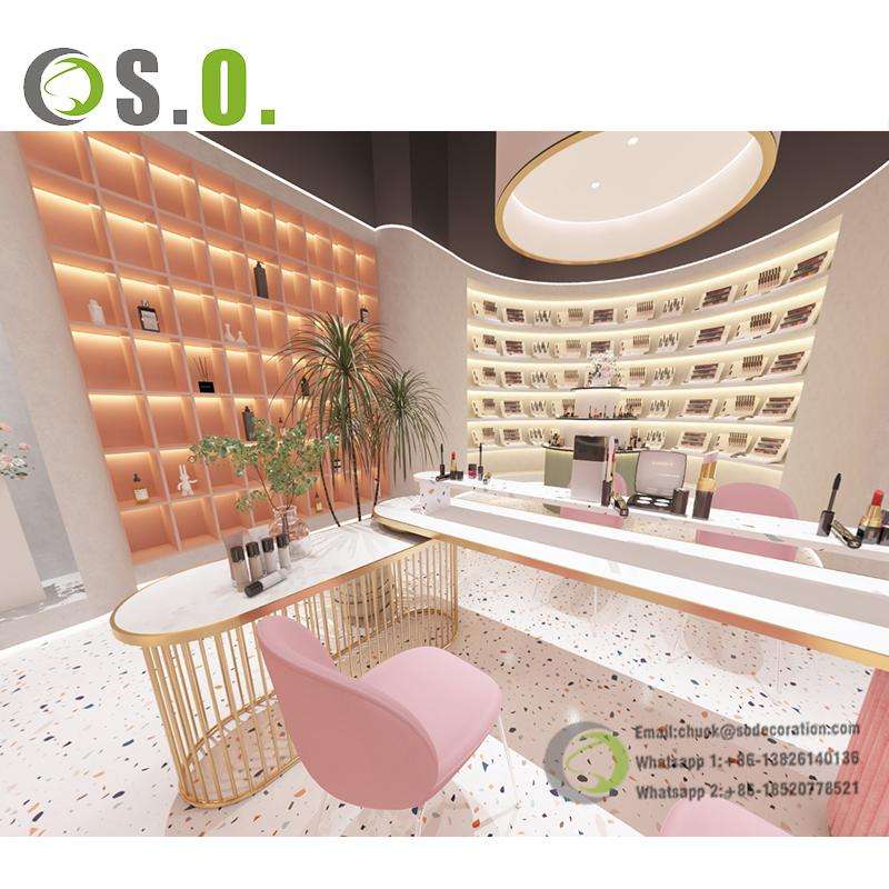 Nuevo diseño, soporte cosmético, muebles de estudio de maquillaje, vitrina de maquillaje con luz LED