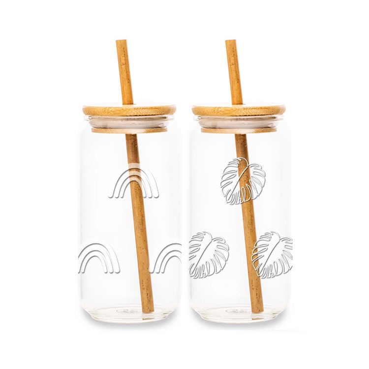 Vaso de cristal personalizado con tapa de bambú y paja, vaso con diseño de hoja de arcoíris, 550ml, 16oz