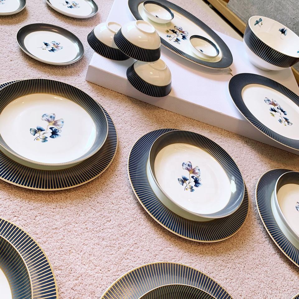 Nuevo diseño europeo azul Gingko patrón lujo hueso China cena conjunto